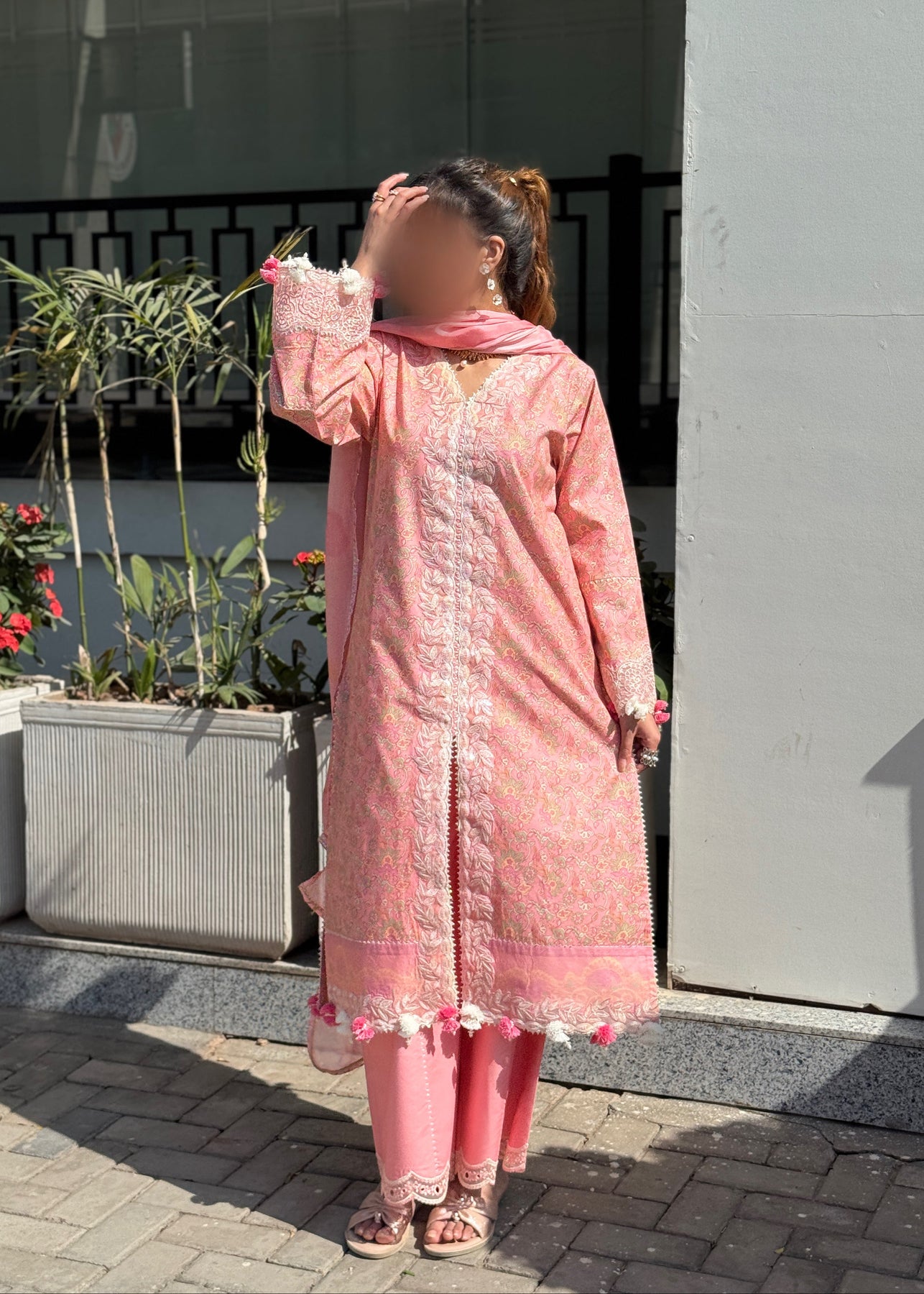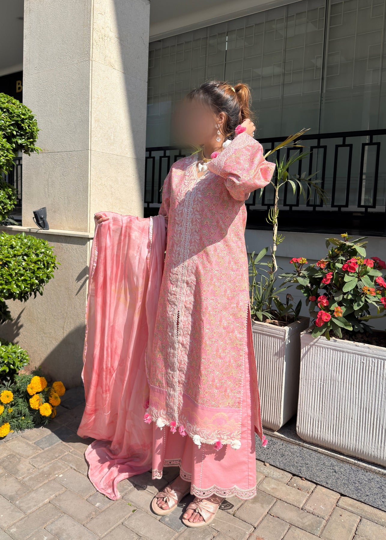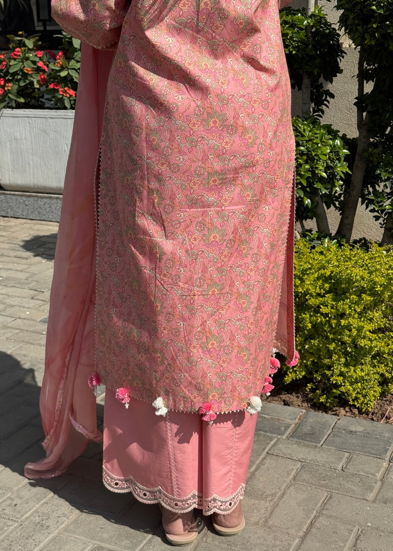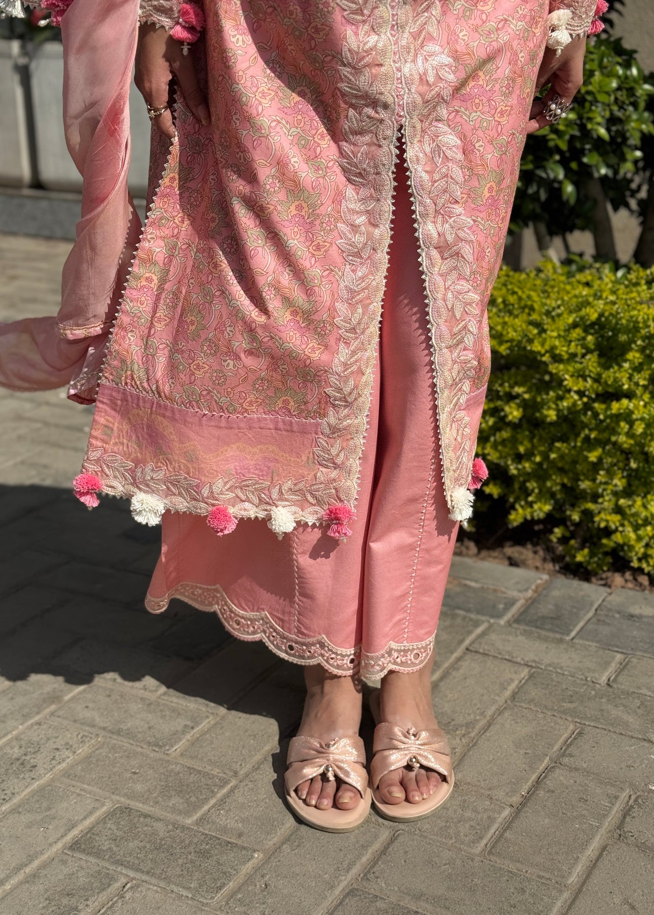 Step out in style in our chic pink outfit, featuring an open-style shirt paired with wide-bottom trousers and a beautifully printed silk dupatta.