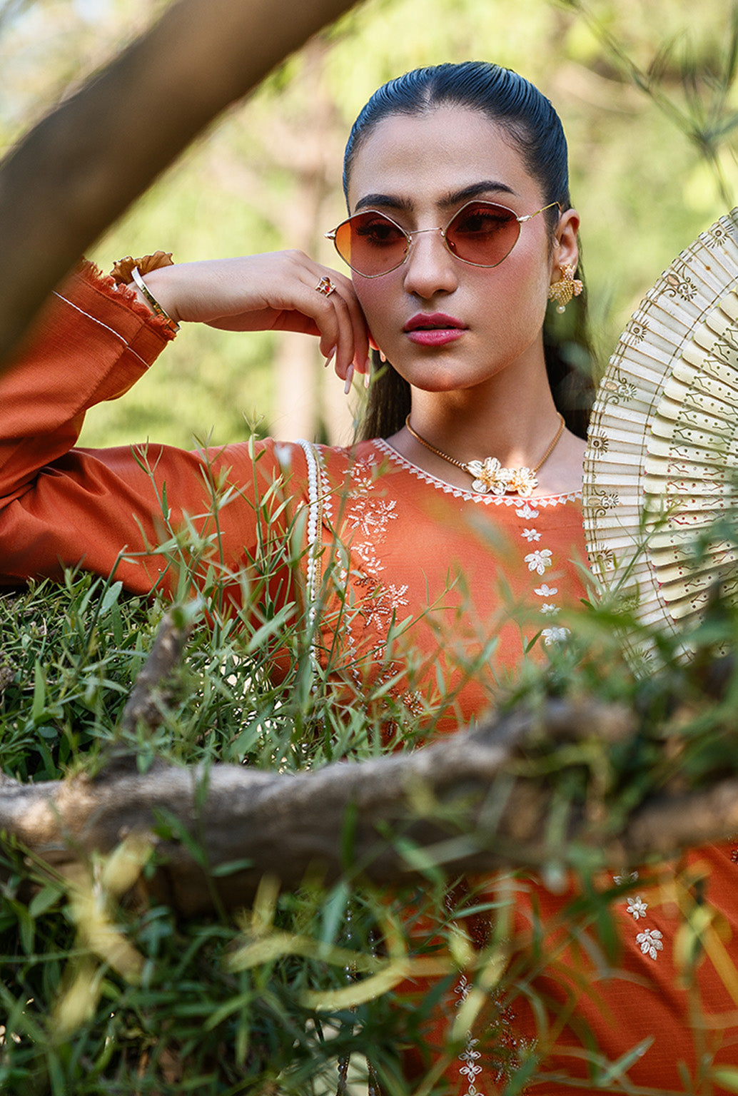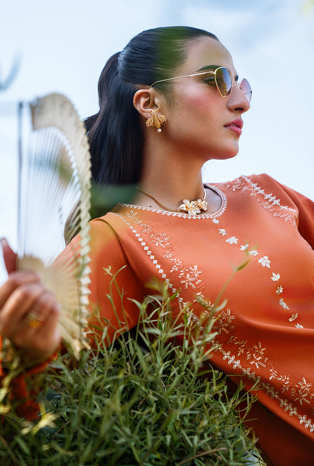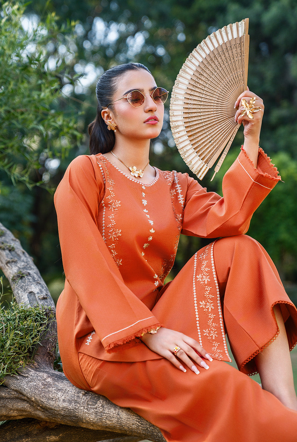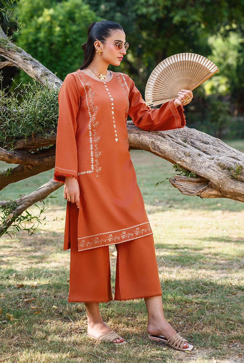 Step out in style in our embroidered Rust textured lawn, featuring Running stitch with fur sleeves with culotte trouser.