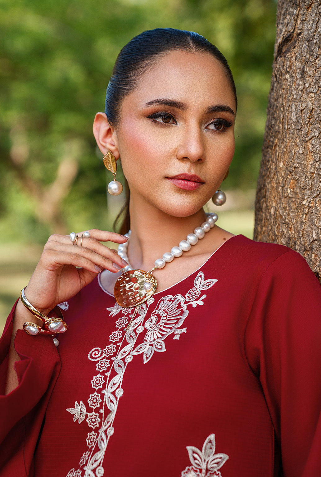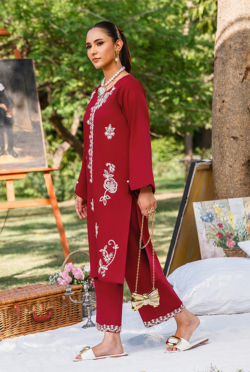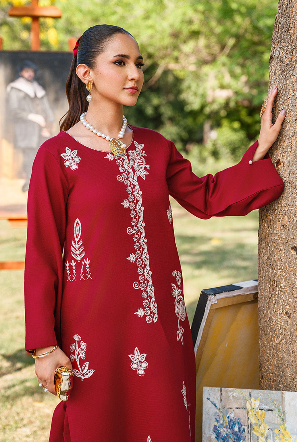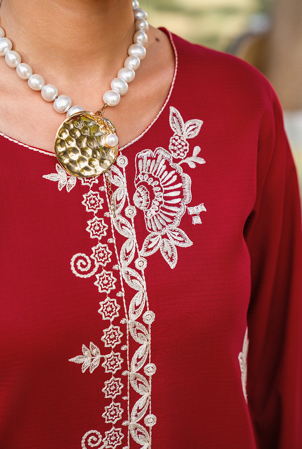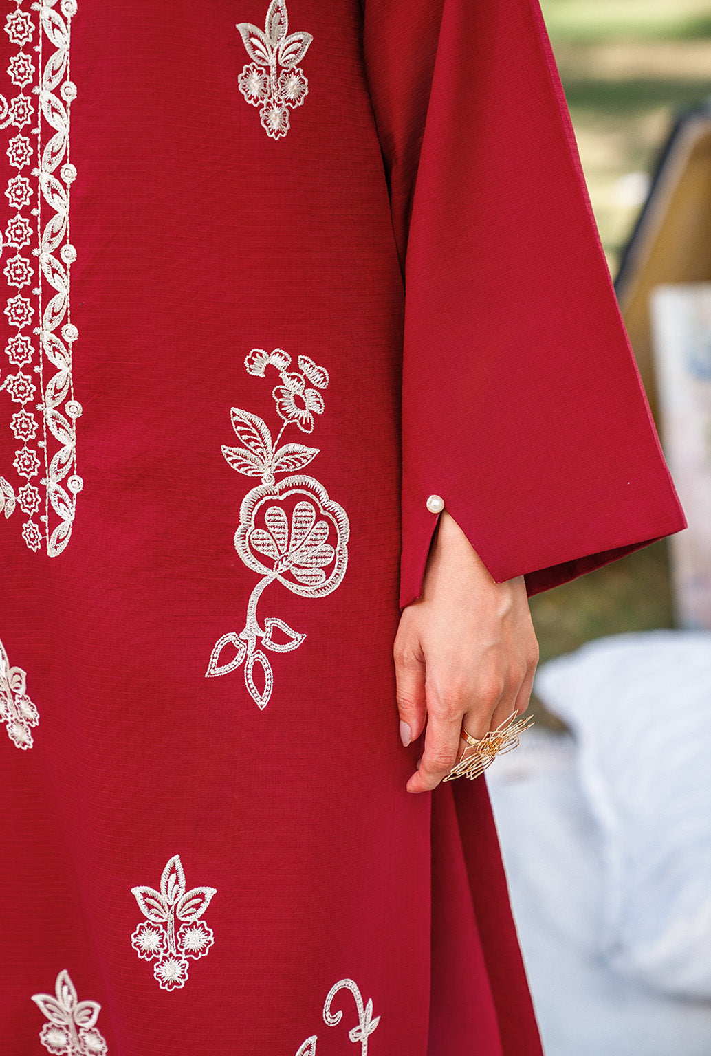 Step out in style in our embroidered Red textured lawn, featuring a round neckline also with embroidered trouser.